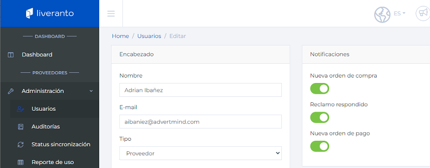Importante: la configuración de las notificaciones solo están disponible para usuarios de tipo proveedores.