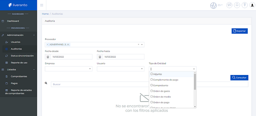A través de la auditoría podrá tener el control de las acciones que efectúa cada usuario. En el caso que el archivo se extenso permite descargarlo a través del botón