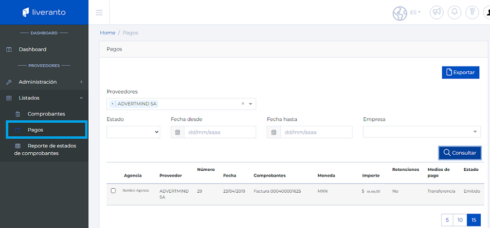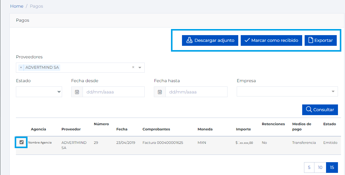 En esta sección se exponen los pagos efectuados por la agencia, permite ver el detalle del mismo, como así también descargar dicha información, para lo cual es necesario seleccionar los documentos a exportar.