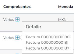 Cuando dentro de un pago se efectúa la cancelación de varias facturas, se muestra en la columna comprobantes la palabra varios, permitiendo si presiona el signo + con el mouse, ver como se compone la misma.