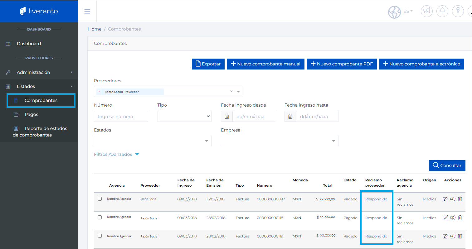 Se expone los comprobantes que fueron reclamados y que recibieron respuesta, se indica en una columna dicho estado. Al presiona sobre la respuesta en la factura se accede al detalle y comentario de la misma.