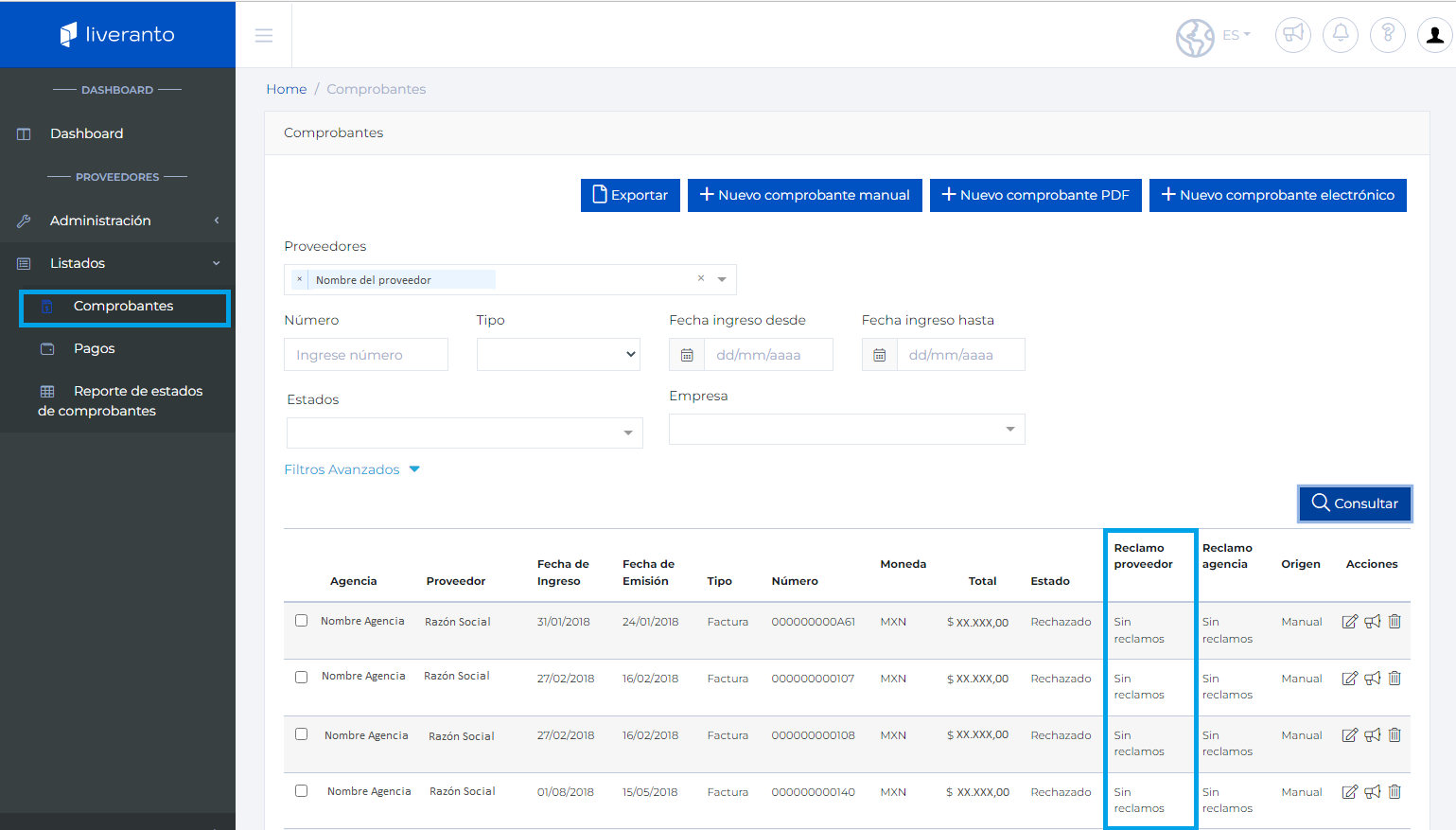 Expone los comprobantes que fueron rechazados por la agencia, donde puede haber una serie de problemas como: