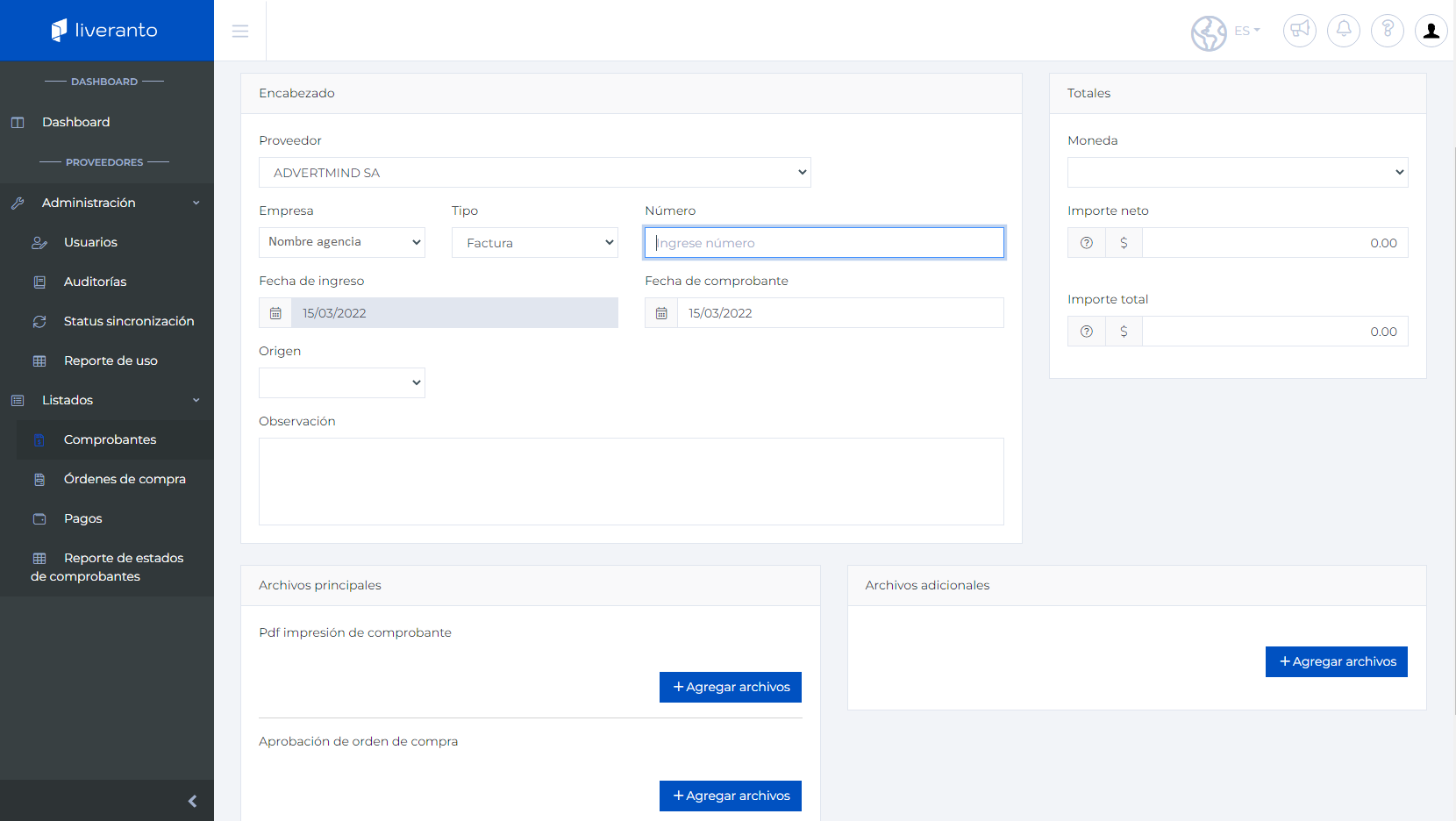 El ingreso del comprobante lo dividiremos en 3 secciones, al finalizar de completar cada una, se debe presionar el botón que se encuentra debajo de la sección de adjuntos.