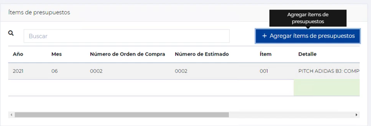 Se va a visualizar una nueva ventana donde se debe seleccionar el ítem del presupuesto/pauta/gasto que genera el pedido.