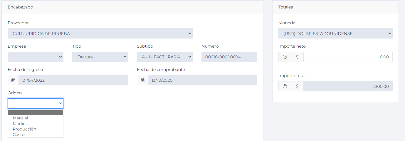 En esta sección se debe indicar cuál es el origen de la solicitud, que puede ser: órdenes de publicidad (MEDIOS), presupuestos (PRODUCCIÓN) o solicitudes de gastos (GASTOS), según corresponda el trabajo que le solicitó la agencia: