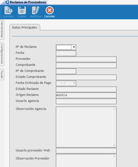 En esta sección permite consultar el reclamo en forma individual, ordenado por proveedor o buscarlo manualmente. Una vez consultado, se debe presionar el botón Modificar e ingresar una nota en el campo Observación Agencia.